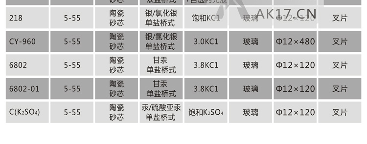 C(K2SO4)參比電極:常用的一種參比電極,其參比溶液中不含氯離子,適合非氯離子場(chǎng)合使用。