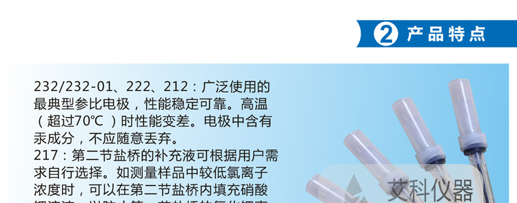 232/232-01、222、212:廣泛使用的**典型參比電極,性能穩(wěn)定可靠。高溫(超過70℃)時(shí)性能變差。電極中含有汞成分,不應(yīng)隨意丟棄。