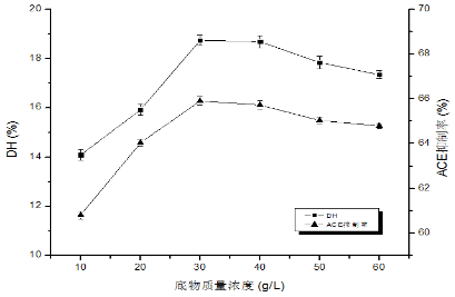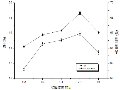 以核桃降壓肽的ACE抑制率和水解度為指標分別考察雙酶復配配比、底物質(zhì)量濃度(g/L)、酶添加量(U/g)、三個因素對核桃降壓肽制備的影響,進行單因素實驗。