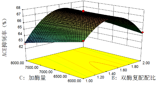 由表3-3的方差分析可知,模型的F值為53.95,P<0.0001,說明該模型是極顯著的,一次項A,B,C均影響極顯著,說明雙酶復配配比、底物質(zhì)量濃度和加酶量對ACE抑制率和水解度具有顯著性影響,交互項AD,BD,CD的偏回歸系數(shù)達到極顯著水平。失擬項在0.05水平上不顯著(P=0.6059),說明殘差均由隨機誤差引起。響應面曲線越陡則影響越顯著,從下圖可以看出堿性蛋白酶與風味蛋白酶添加量比例與底物濃度交互作用曲線相對較陡,說明二者交互作用相對明顯,對水解效果的影響相對較強,酶解溫度曲線變化則比較平緩,對水解效果影響相對較弱。
