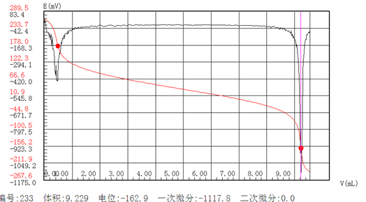 突躍量的選擇:經(jīng)過試驗,發(fā)現(xiàn)鹽酸金剛烷胺滴定時溶液第二終點(diǎn)電位突躍不很明顯,故選擇突躍量時應(yīng)特別注意。(建議**終點(diǎn)突躍量:500 第二終點(diǎn)突躍量:150。)