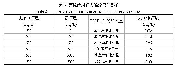 2.1.1  氨濃度對(duì)銅去除效果的影響  我們用CuCl2和氨水配制了四種氨濃度不同的溶液各100mL,其中銅離子濃度均為500mg/L,而NH3的濃度分別為0、50、500和5000mg/L。然后按化學(xué)反應(yīng)摩爾比的劑量(TMT與Cu的反應(yīng)摩爾比為2:3)加入TMT-15,靜置30min后,取上層清液測(cè)定剩余銅濃度,結(jié)果見表2。從表2中可以看出,在銅的初始濃度與TMT-15的加入量都相同的條件下,溶液中絡(luò)合劑氨的濃度越高,處理后的殘余銅濃度也越高,銅的去除率下降。對(duì)于這種氨濃度較高的銅氨溶液,為了使其處理后的殘余銅濃度低于0.5mg/L的排放標(biāo)準(zhǔn)[4],我們加大了TMT-15的劑量,以便有足夠多的TMT分子來解離穩(wěn)定的銅氨絡(luò)合離子,試驗(yàn)結(jié)果也列入表2。可見,對(duì)于NH3濃度分別為500和5000mg/L的銅溶液而言,當(dāng)加入TMT的摩爾劑量增加5%與15%時(shí),殘余銅濃度便可降**0.5mg/L以下。