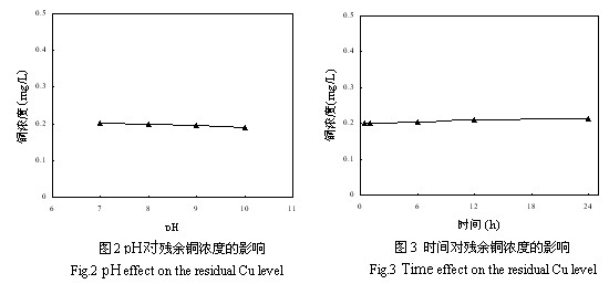 2.1.2  pH值對(duì)銅去除效果的影響  因?yàn)橛∷㈦娐钒褰?jīng)堿性蝕刻后產(chǎn)生的廢水的pH值范圍一般在7~10之間,所以我們研究了溶液初始pH值為7、8、9和10時(shí)對(duì)銅去除效果的影響。處理前溶液的銅濃度均為500 mg/L,氨濃度為5000 mg/L,用2 M NaOH 和HCl調(diào)溶液的pH到一定值后,再加入1.15倍摩爾劑量的TMT-15進(jìn)行處理,試驗(yàn)結(jié)果見圖2。從圖中可以看出,當(dāng)溶液pH值在7~10之間時(shí),經(jīng)TMT處理后的殘余銅濃度均較低;因此當(dāng)pH在7~10之間波動(dòng)時(shí),不會(huì)影響TMT對(duì)銅的去除效果。
