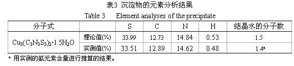 2.2.1  元素分析  我們將制備的沉淀物進(jìn)行元素分析,結(jié)果見表3,試驗(yàn)數(shù)據(jù)表明獲得的沉淀的分子式與Cu3(C3N3S3)2•1.5H2O基本一致。