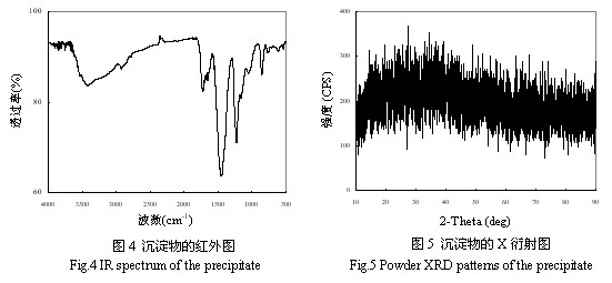2.2.3  XRD圖的分析  圖5為沉淀產(chǎn)物的X射線衍射圖。圖中均為彌散的散射區(qū),無明顯的衍射峰,表明生成的沉淀為非晶體。