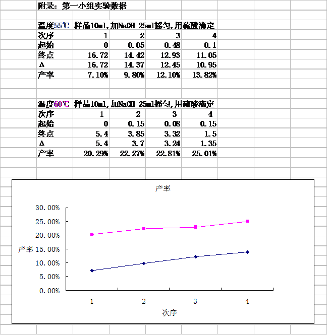 2、 第二組反應(yīng)溫度比**組高5度,但是產(chǎn)率卻大大高于**組,我們分析出現(xiàn)這種現(xiàn)象的原因可能是溫度升高在較短的反應(yīng)時(shí)間內(nèi)對(duì)反應(yīng)速率影響較大。