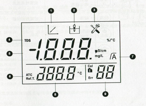 ④TDS因子設(shè)置或參數(shù)設(shè)置 ⑤電導(dǎo)率/TDS讀數(shù)或電極常數(shù) ⑥自動溫度補(bǔ)償